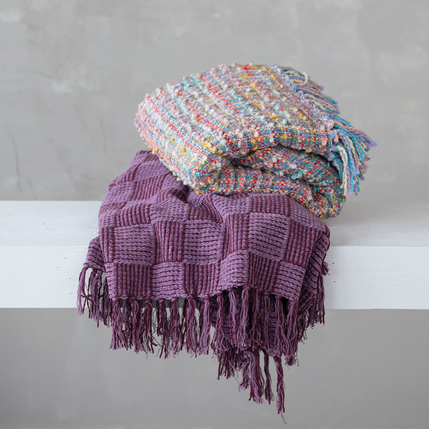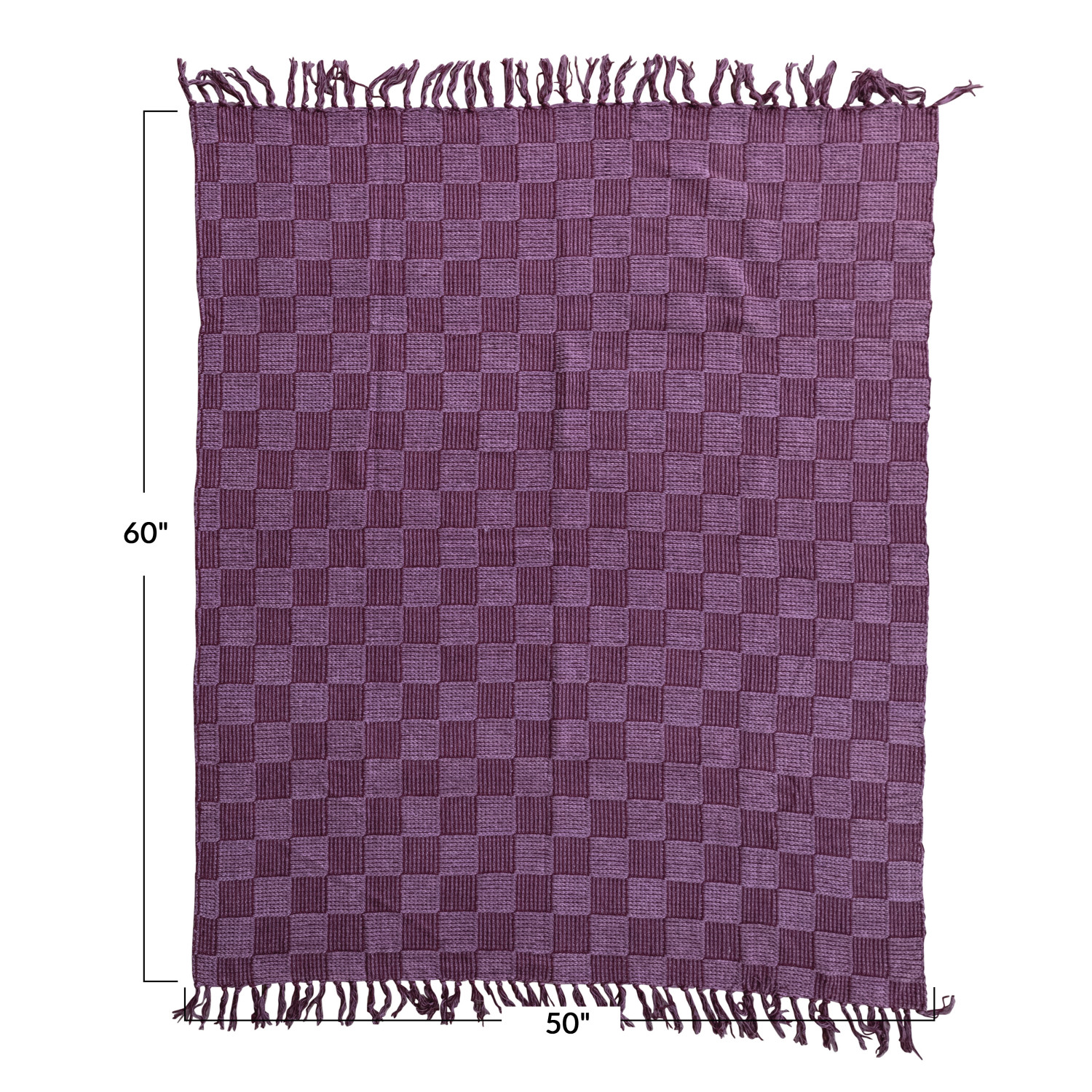 Woven Cotton Blend Chenille Throw with Check Pattern & Fringe
