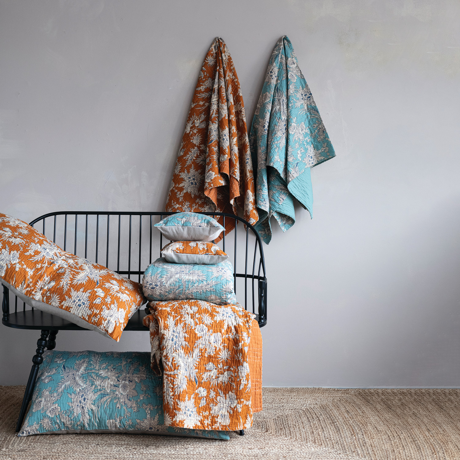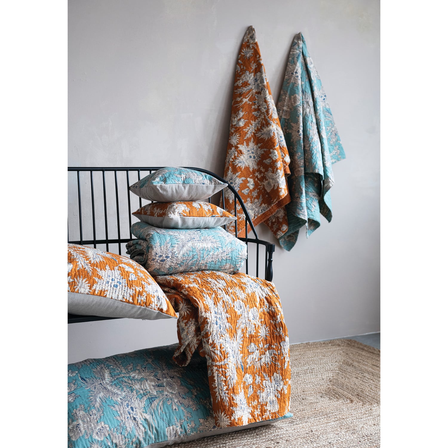 Catalog Name: 60"L x 50"W Cotton Voile Printed Throw w/ Florals & Hand-Embroidered Kantha Stitch, Blue & White