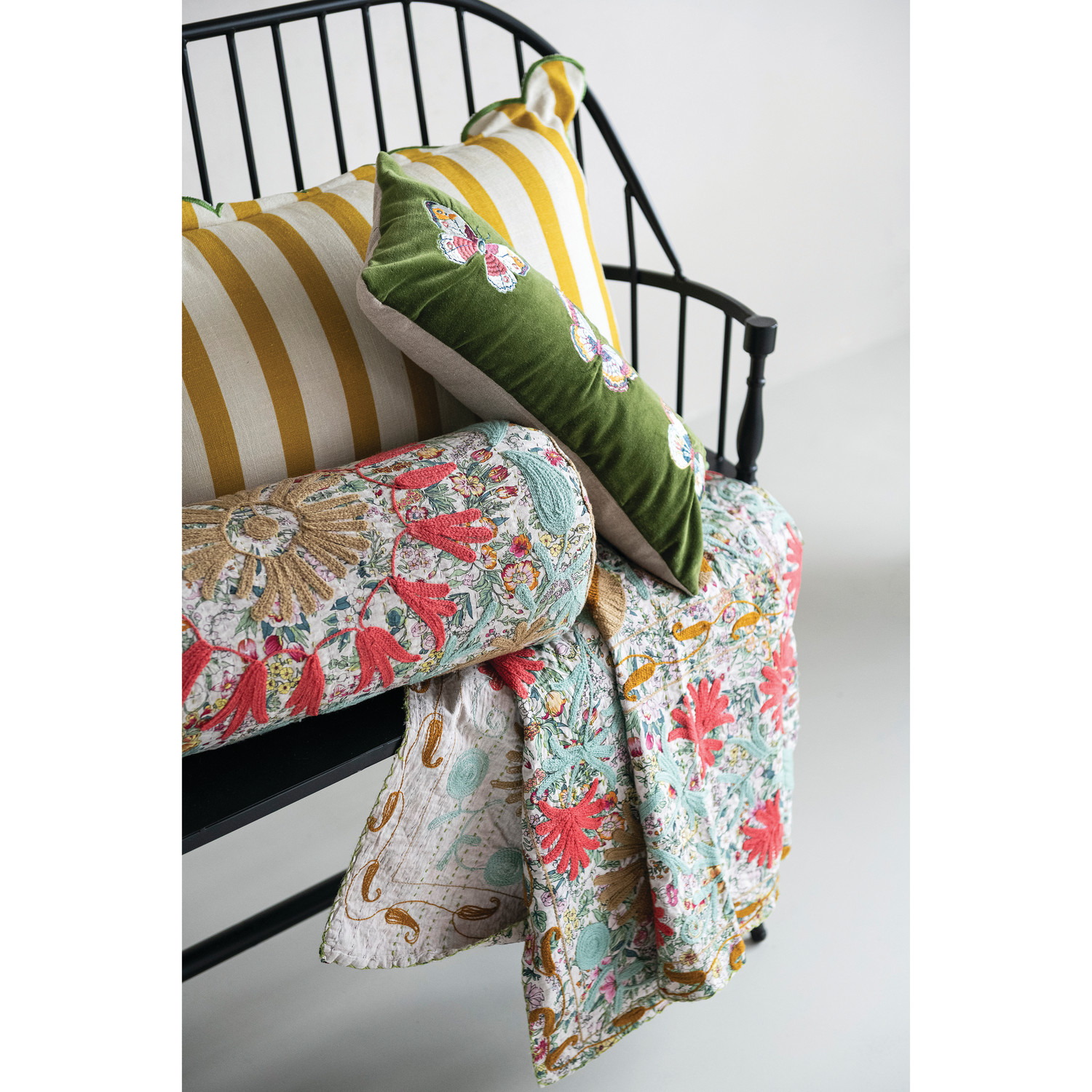 Stonewashed Cotton Voile Two-Sided Throw with Suzani Pattern & Hand-Embroidered Kantha Stitch