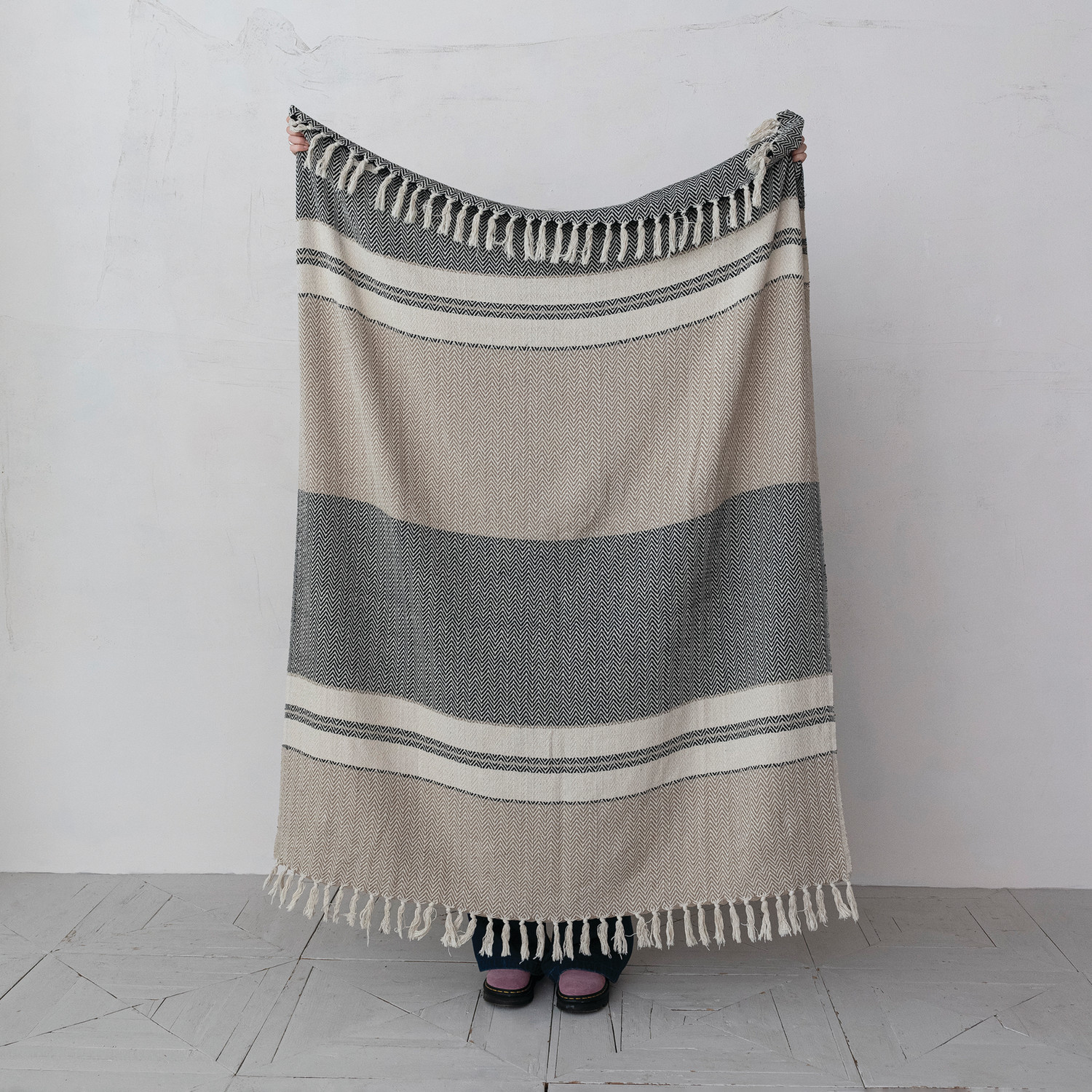 60"L x 50"W Woven Recycled Cotton Striped Throw with Fringe, Beige, Grey & Cream Color