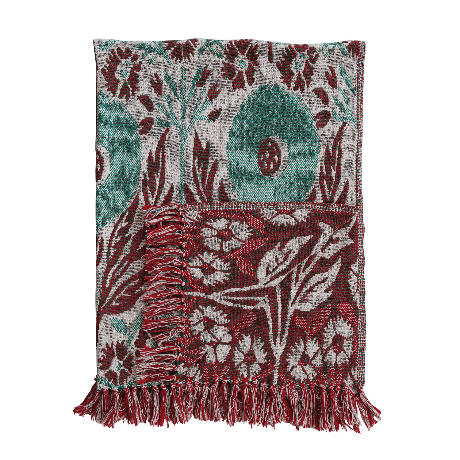 Woven Cotton Blend Jacquard Throw with Flower Pattern & Fringe, Natural, Green & Berry Color