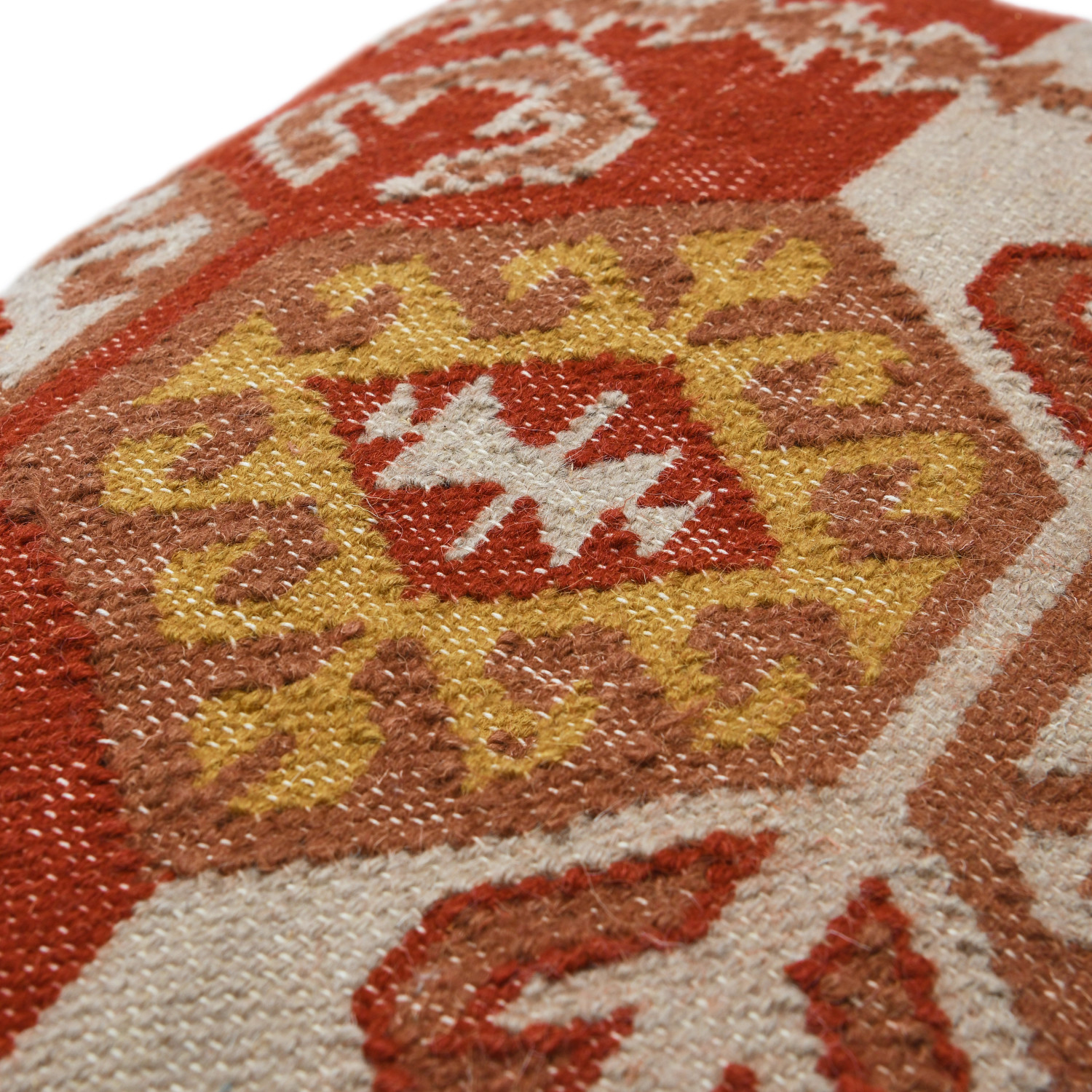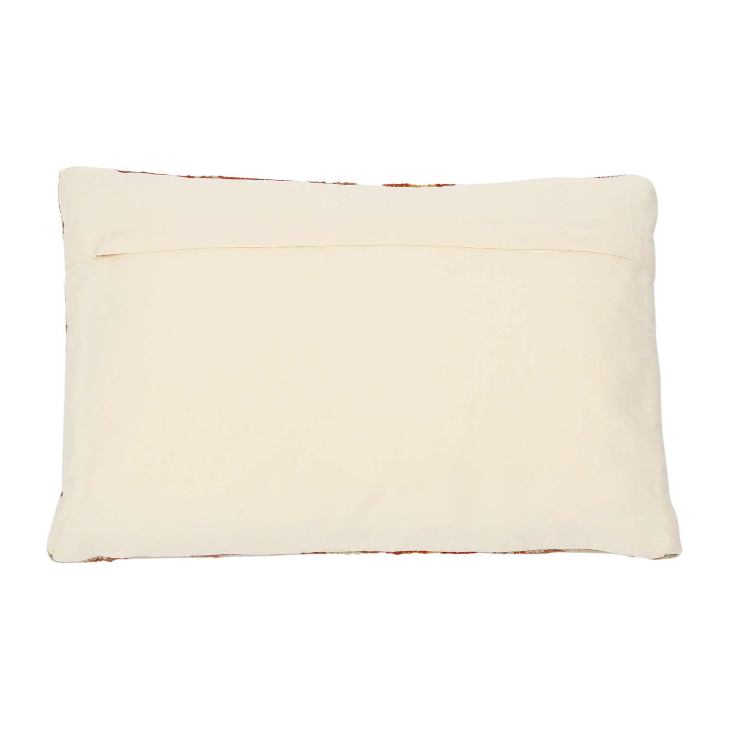 This southwestern lumbar pillow cover showcases a luxurious wool blend kilim with an intricately woven Aztec design. Multicolor wool blend kilim lumbar pillow with Aztec design; Natural cotton encasement on back. Express your constantly evolving style with the simple addition of this eye-catching pillow. Removable cotton throw pillow cover with polyester insert; Back zipper with hidden flap; Dry clean only.