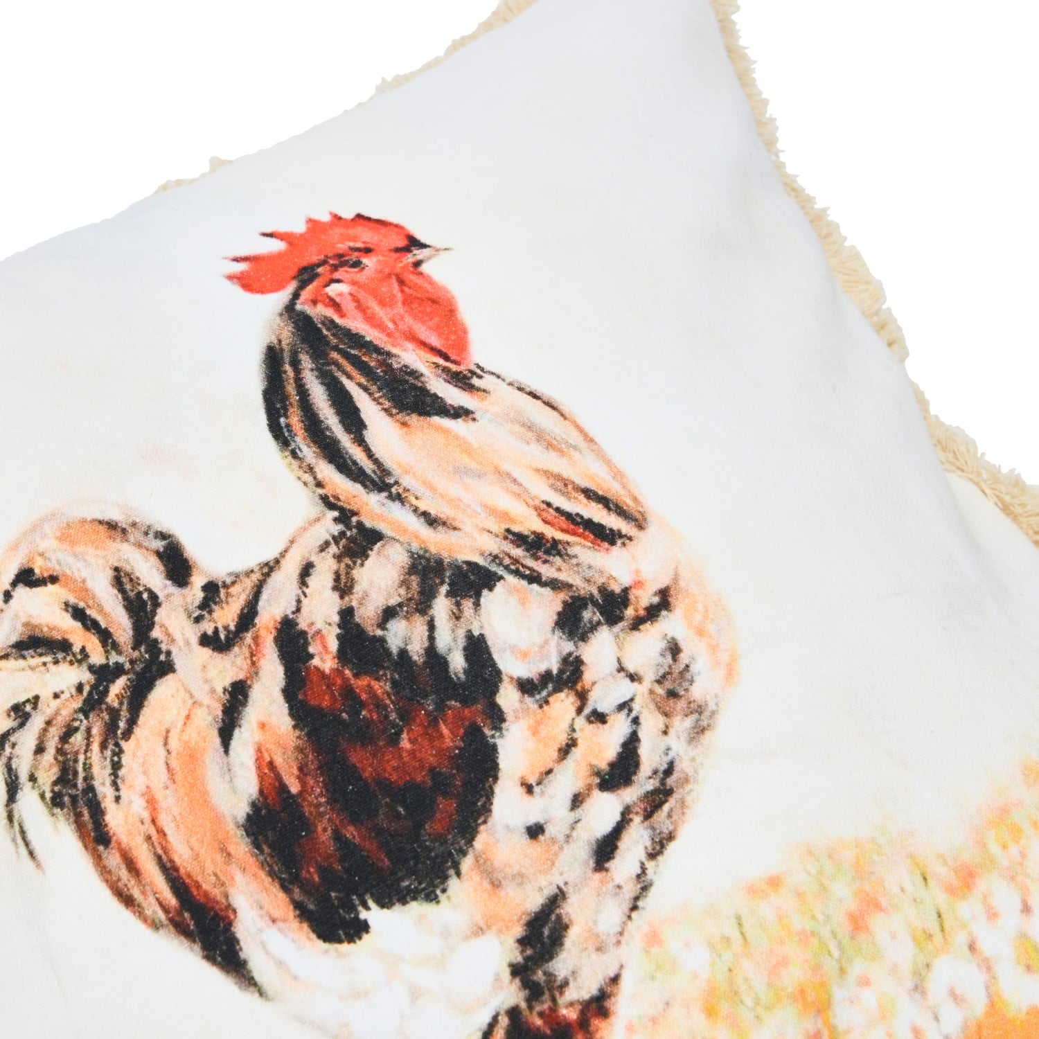 This playful throw pillow cover features a painterly rooster illustration on cotton, finished with delicate eyelash fringe. Multicolor cotton throw pillow with rooster illustration; Natural cotton encasement on back. Express your constantly evolving style with the simple addition of this eye-catching pillow. Removable cotton throw pillow cover with polyester insert; Back zipper with hidden flap; Machine wash cold, gentle cycle, do not bleach, warm iron if needed, trim and comb edges after washing.