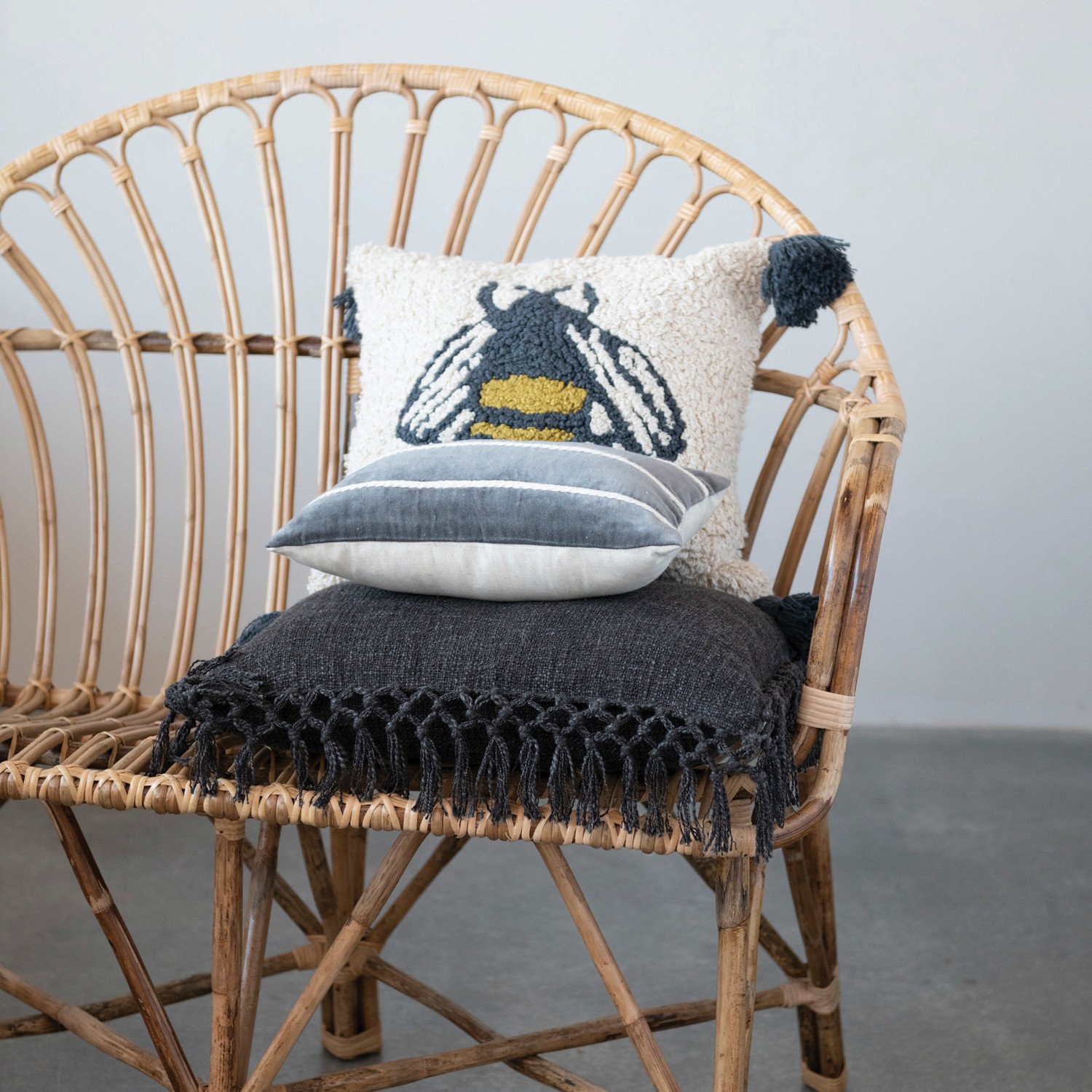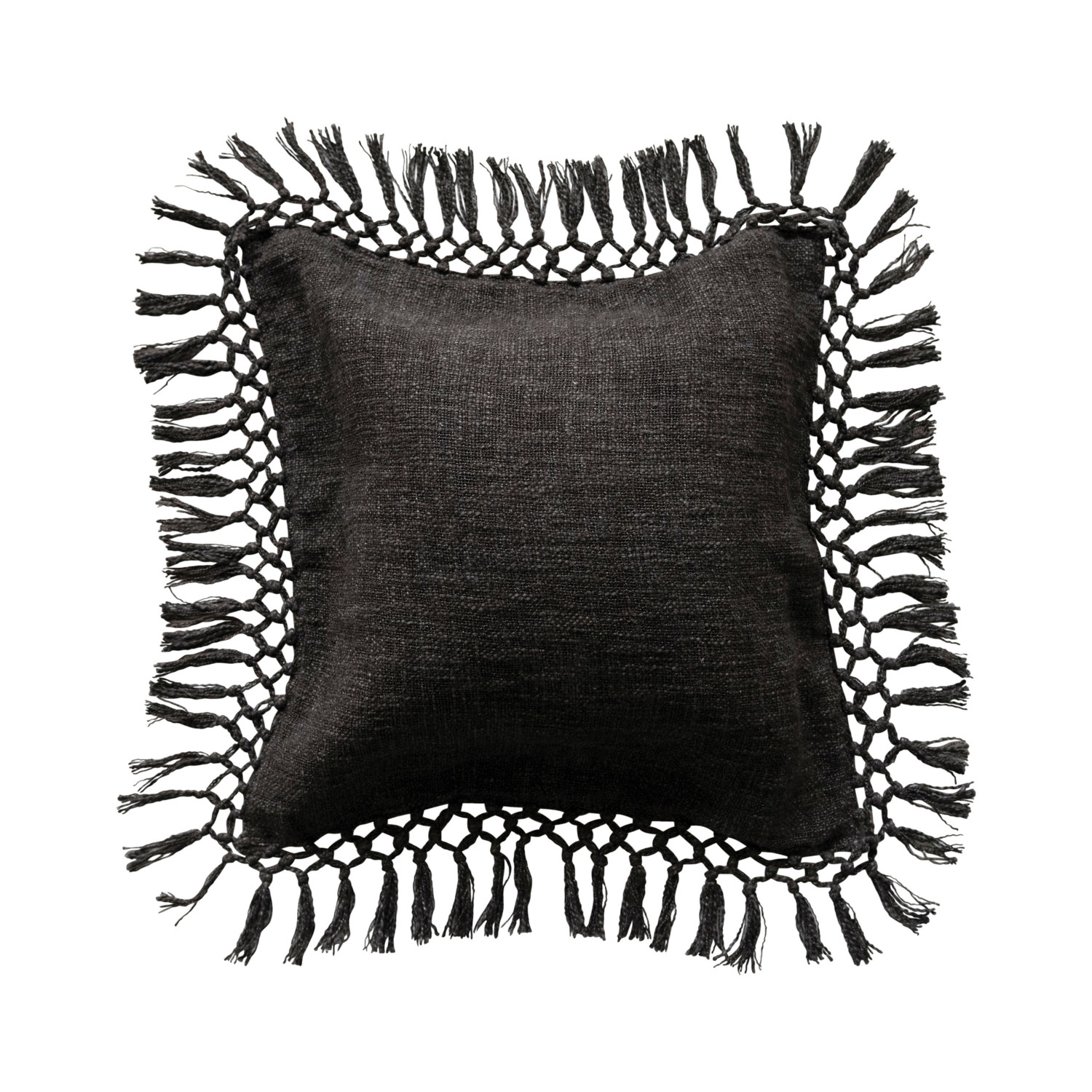 This rustic throw pillow cover features soft cotton slub construction, finished with intricately woven crochet and fringe. Black cotton slub throw pillow with crochet and fringe. Express your constantly evolving style with the simple addition of this eye-catching pillow. Removable cotton throw pillow cover with polyester insert; Hand wash, warm iron if needed.