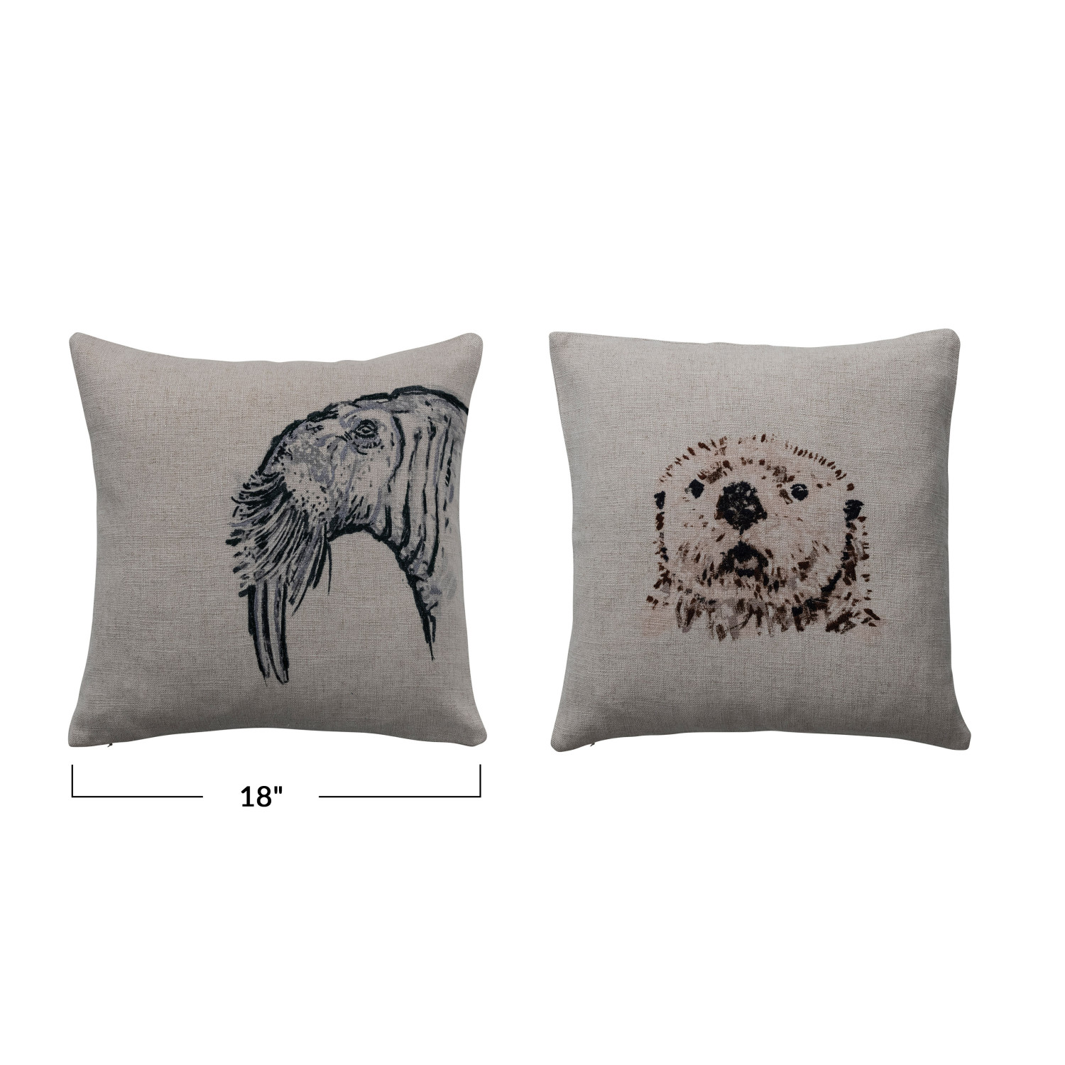 Catalog Name: 18" Square Linen Blend Printed Pillow w/ Walrus/Otter & Embroidery, Natural & Sepia/Grey, 2 Styles ©