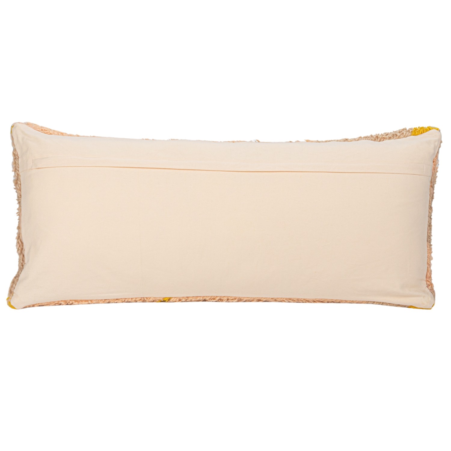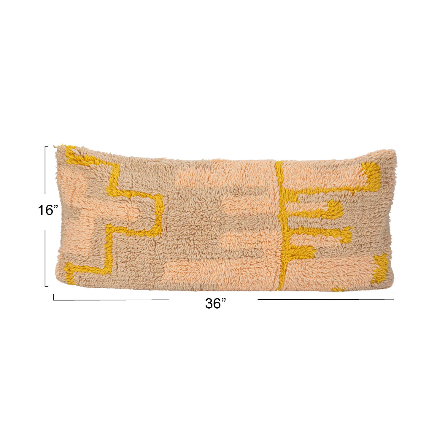 This New Zealand wool shag lumbar pillow is a plush and cozy piece that adds a touch of farmhouse, transitional, lodge, cabin, or modern style to any space. The pillow features a rich, fluffy New Zealand wool shag fabric in pink, yellow, and cream colors, with a geometric design. The pillow has a polyester fill for softness and comfort, providing extra support and durability. The pillow is easy to care for and spot clean, measuring 36 inches in length and 16 inches in height. This versatile accessory can add a touch of farmhouse, transitional, lodge, cabin, or modern style to any space, making it a great choice for creating a cozy and inviting atmosphere or a lively and stylish vibe.