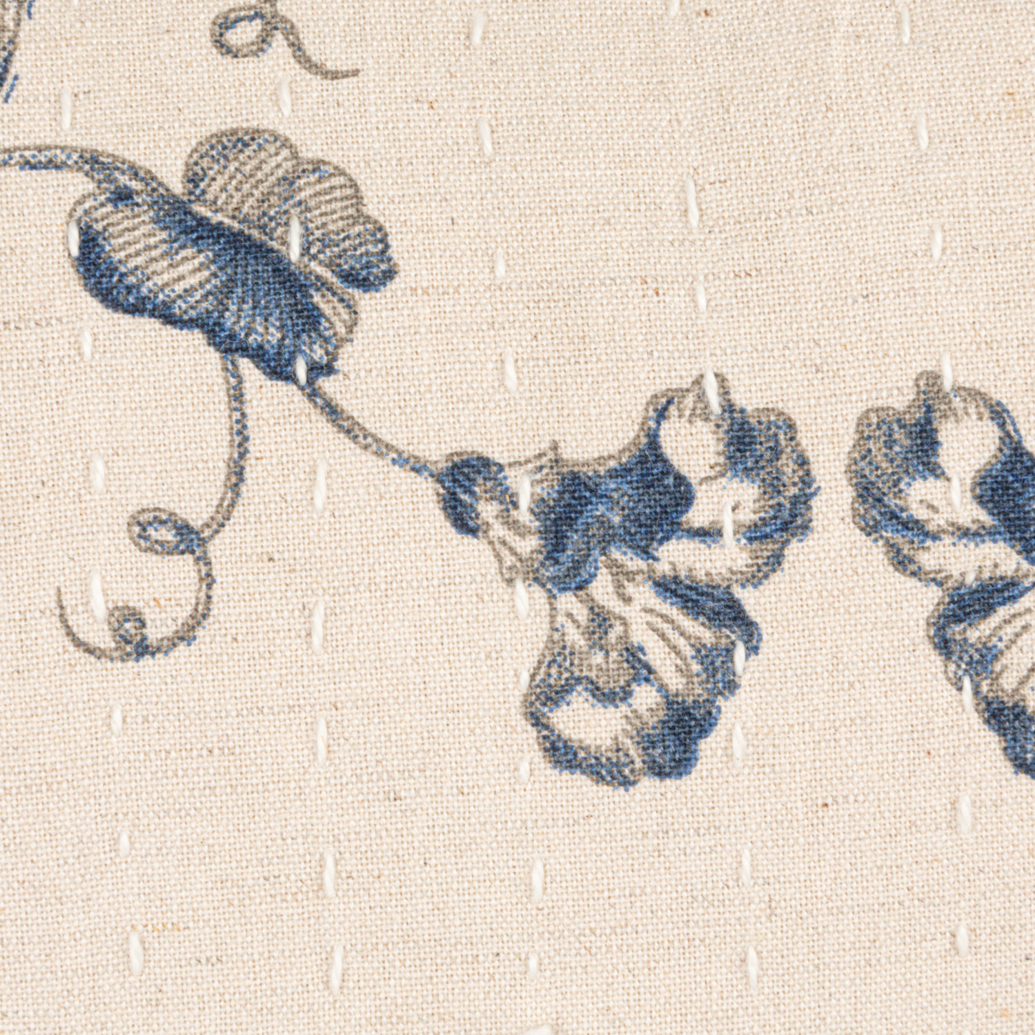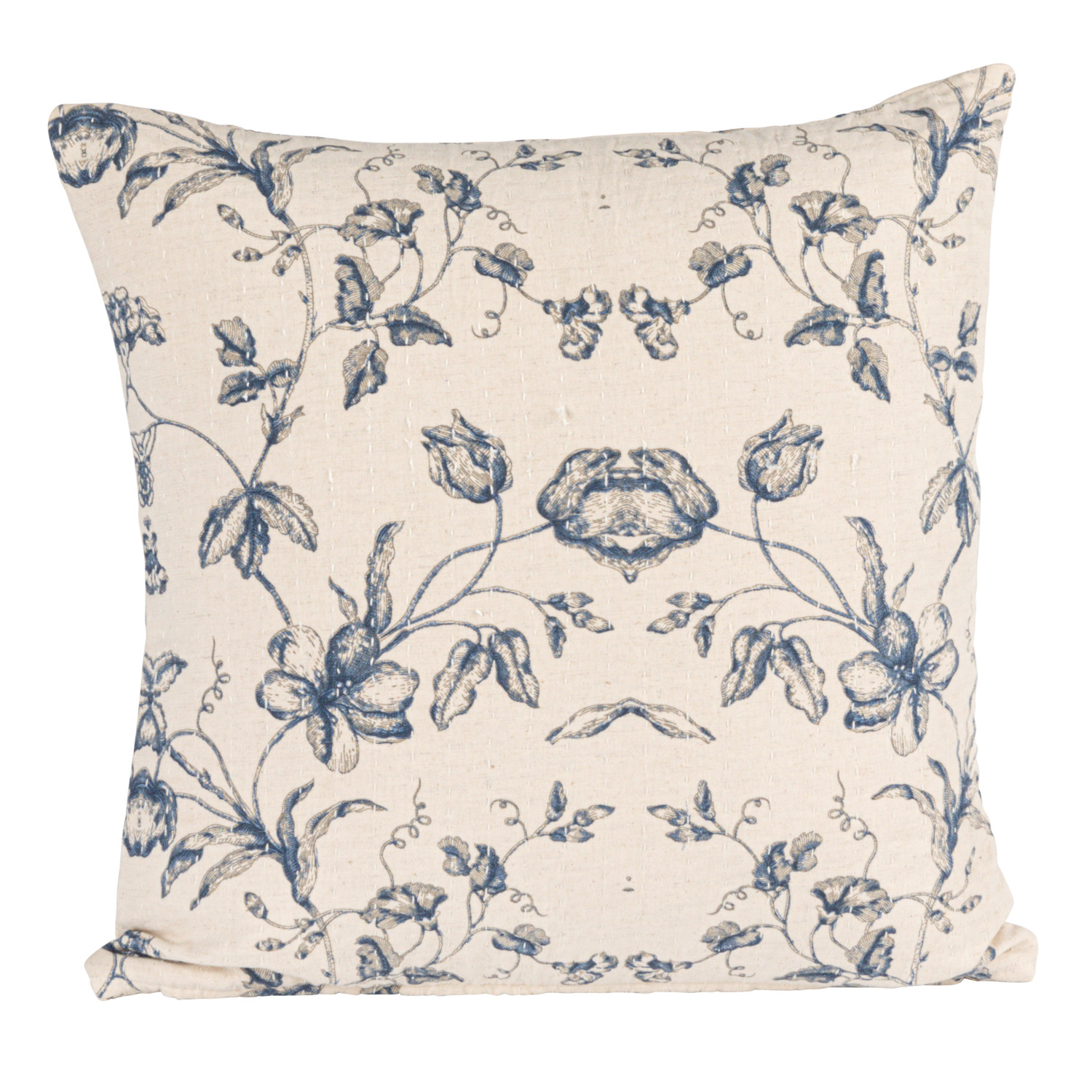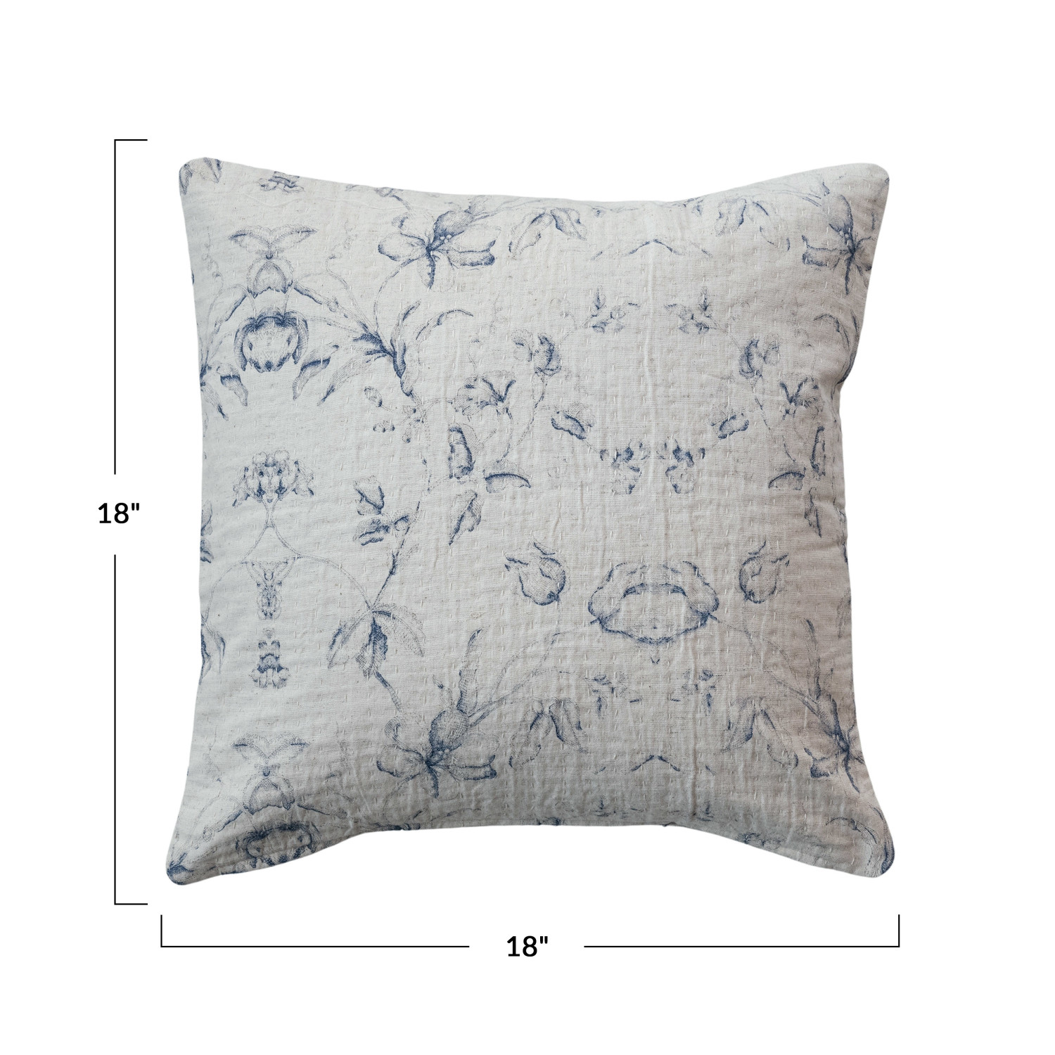 Catalog Name: 18" Square Cotton & Linen Printed Pillow w/ Floral Pattern, Hand-Embroidered Kantha Stitch & Chambray Back, Natural & Blue (Each One Will Vary)