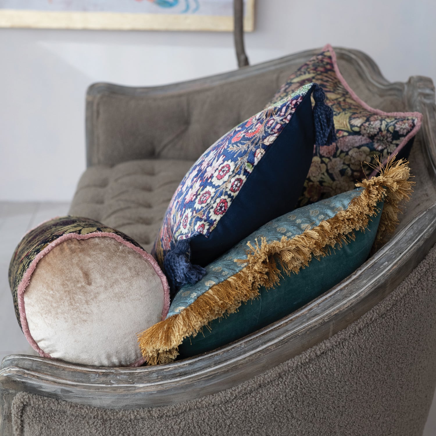 Cotton Velvet Printed Lumbar Pillow w/ Woodland Pattern & Tassels