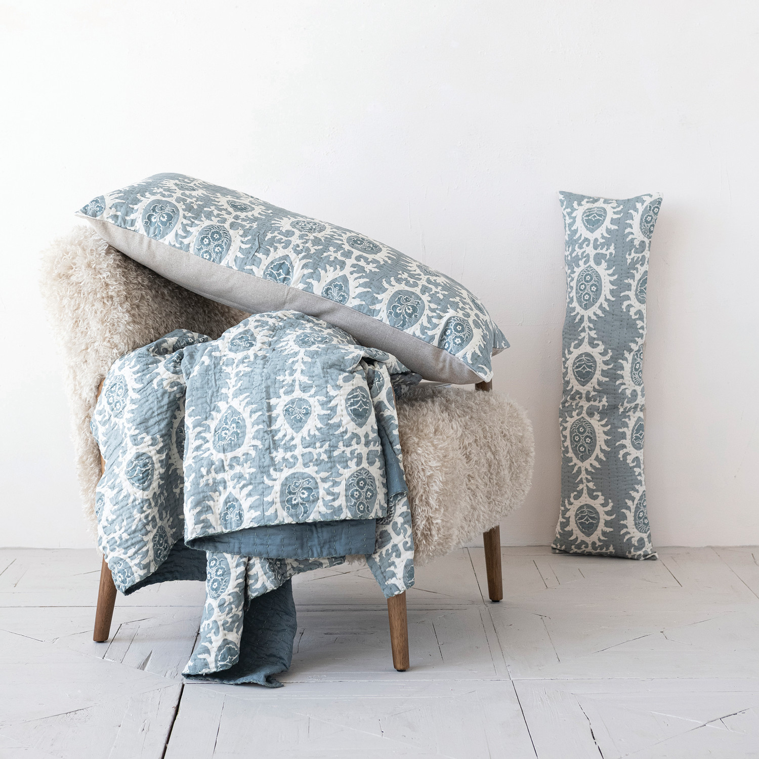 Catalog Name: 36"L x 10"H Cotton Voile Printed Lumbar Pillow w/ Pattern, Hand-Embroidered Kantha Stitch & Chambray Back, Blue & White
