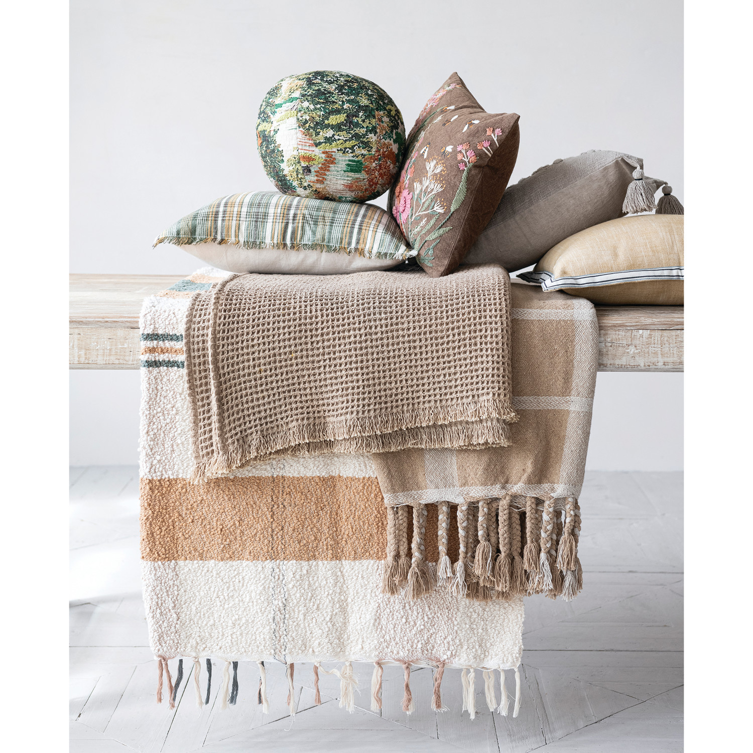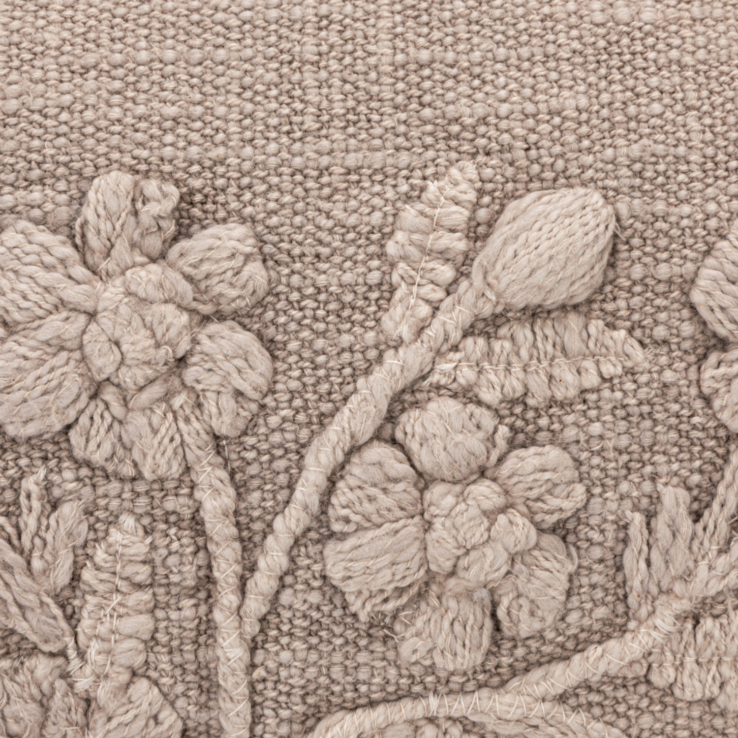 Stonewashed Cotton Slub Lumbar Pillow with Embroidered Flowers & Tassels, Taupe