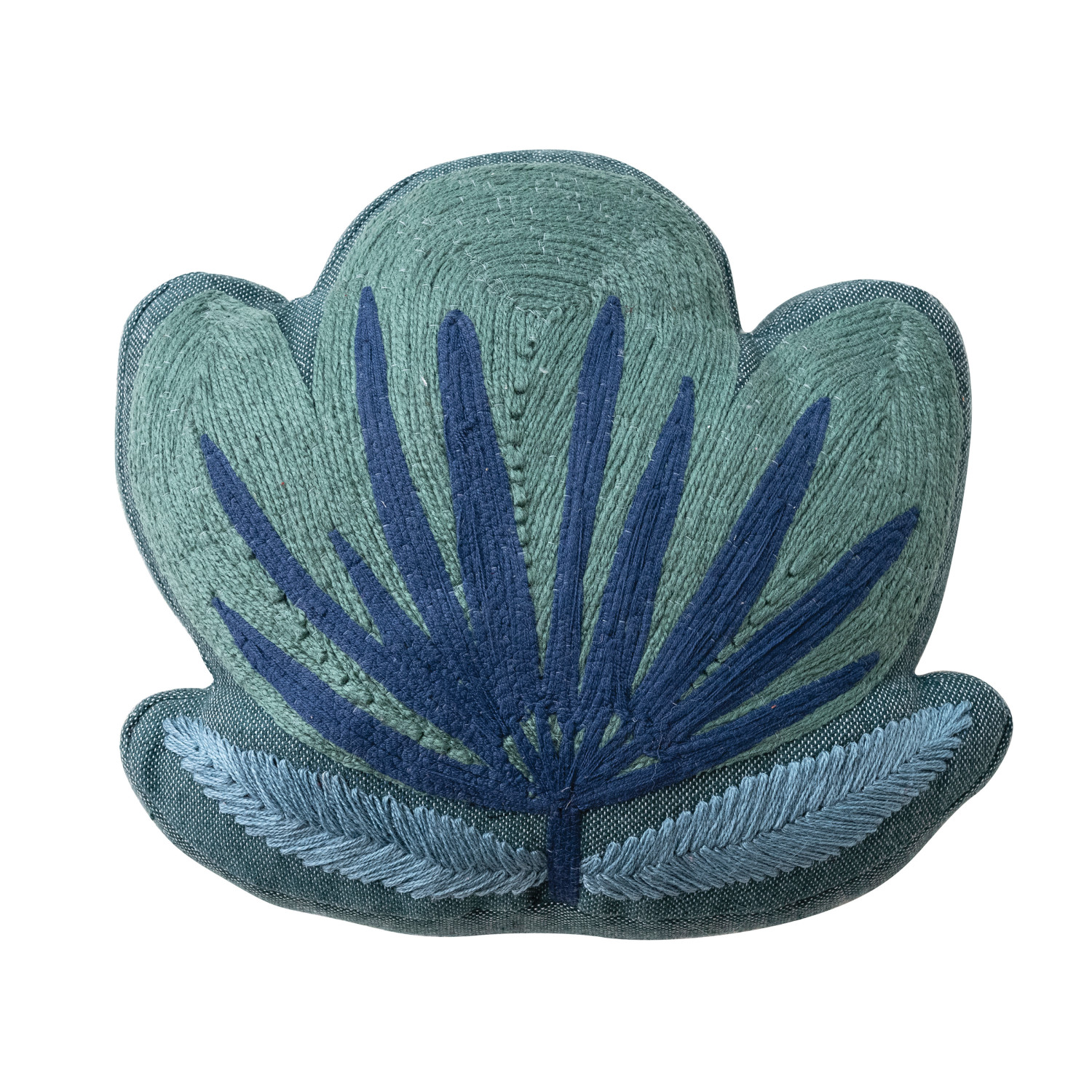 Catalog Name: 14"L x 13"H Woven Fabric Indoor/Outdoor Flower Shaped Pillow w/ Embroidery, Green & Blue