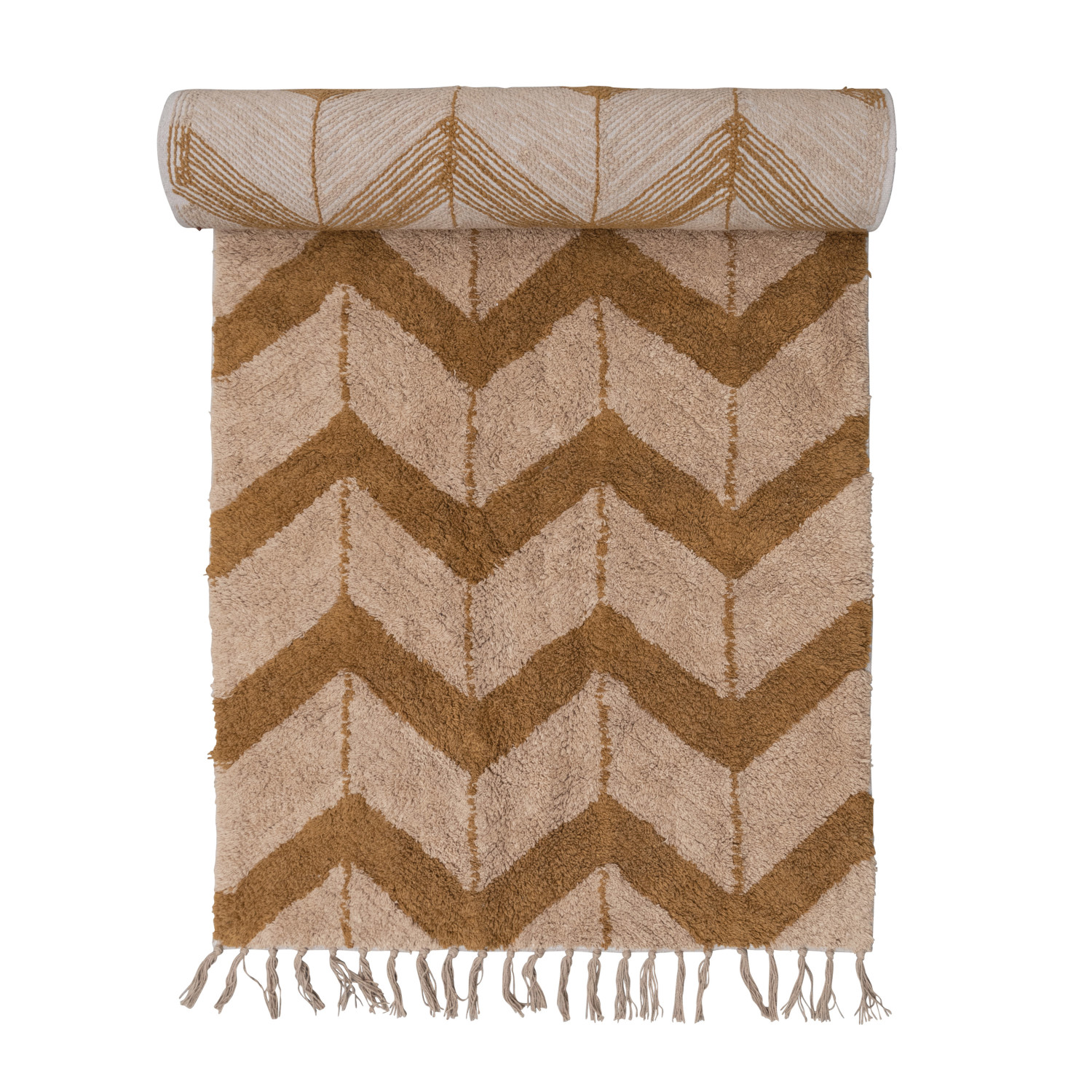 This boho inspired runner rug showcases supple tufted cotton with a 2-tone chevron pattern and decorative fringe.