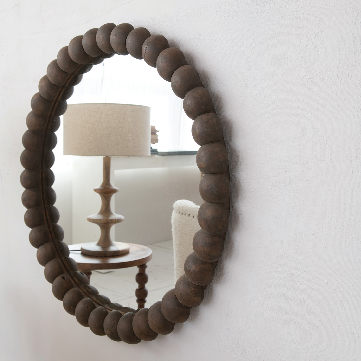 Approximately 38" Round Reclaimed Wood Bobbin Framed Wall Mirror, Natural