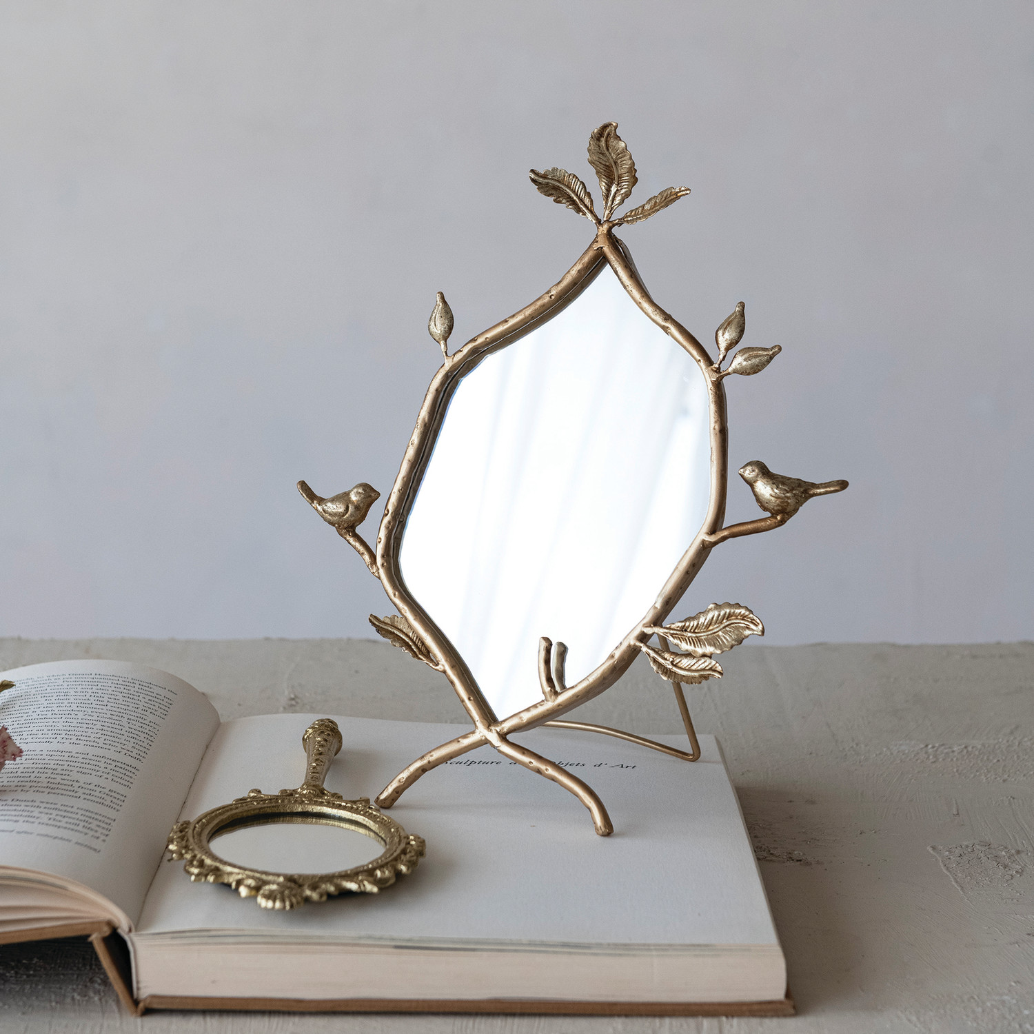 Embossed Metal Framed Hand Mirror, Antique Gold Finish