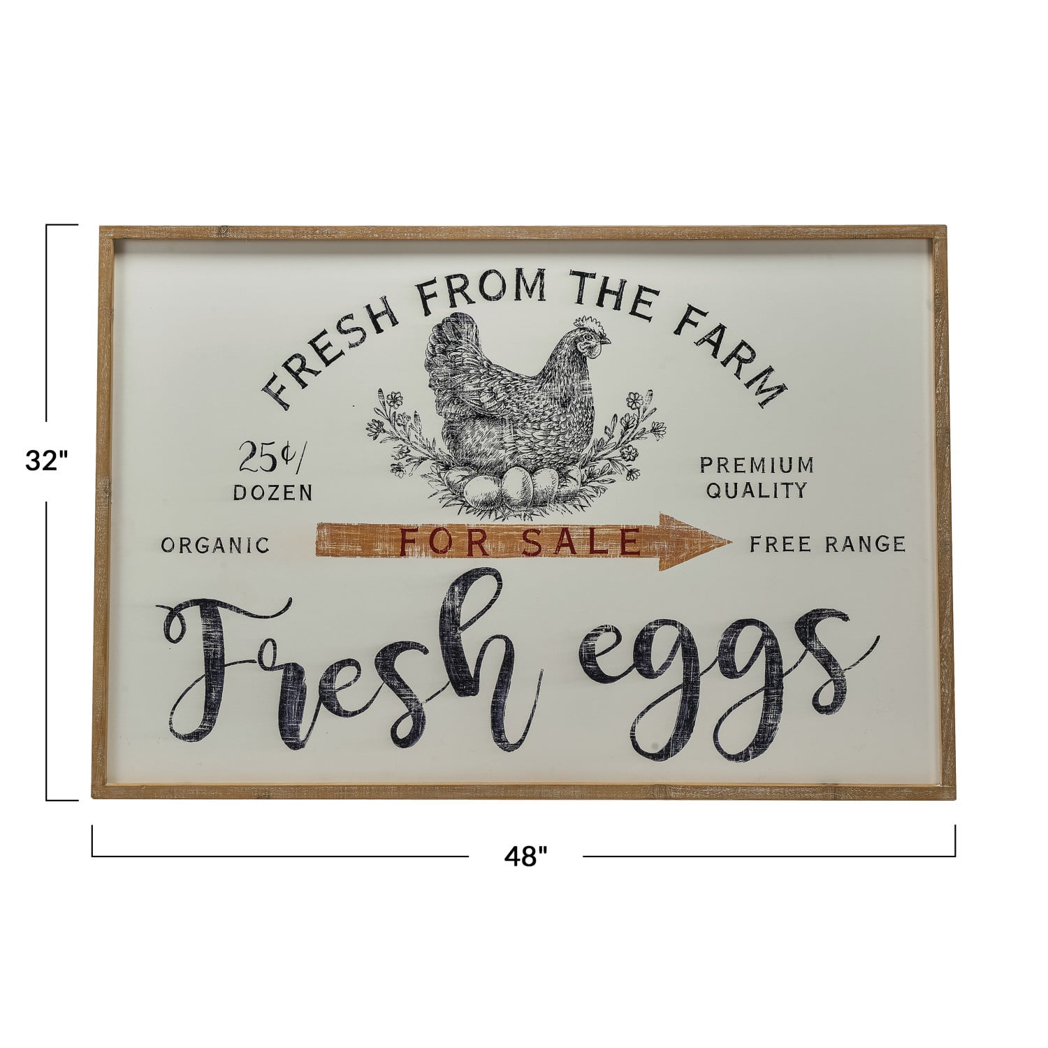 This "Fresh From The Farm" wall decor is a testament to classic farmhouse aesthetics, crafted with care from pine wood. The piece's generous dimensions and the inviting text evoke a sense of nostalgia and connection to rural life. Its rectangular frame and the multi-tonal wood grains provide a perfect canvas for the charming message, making it a delightful addition to any room that celebrates the simplicity and allure of the farmhouse or French country design. It measures 48 inches in length by 32 inches in height, making a substantial statement on any wall. Additionally, the distressed finish adds a touch of vintage charm to the piece.