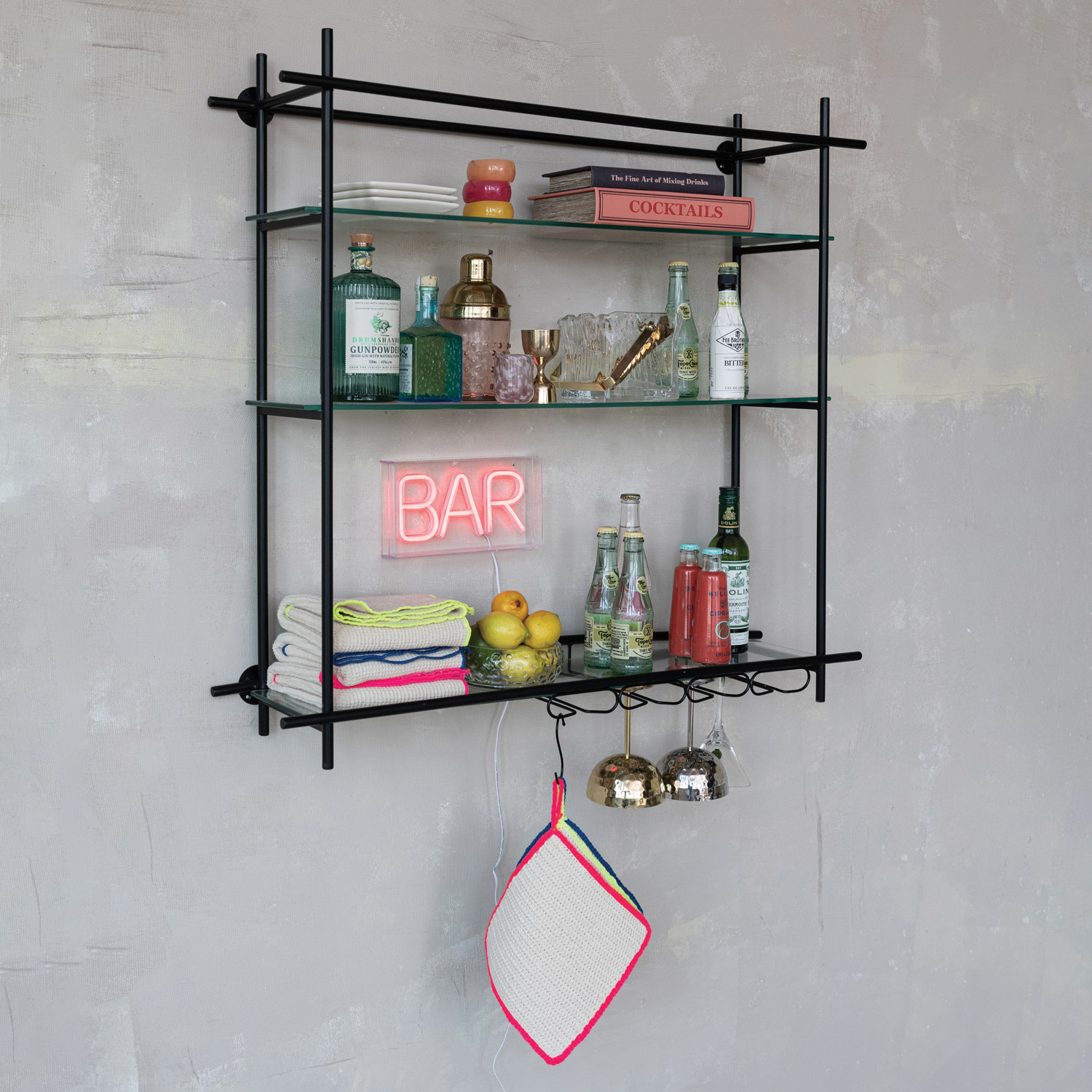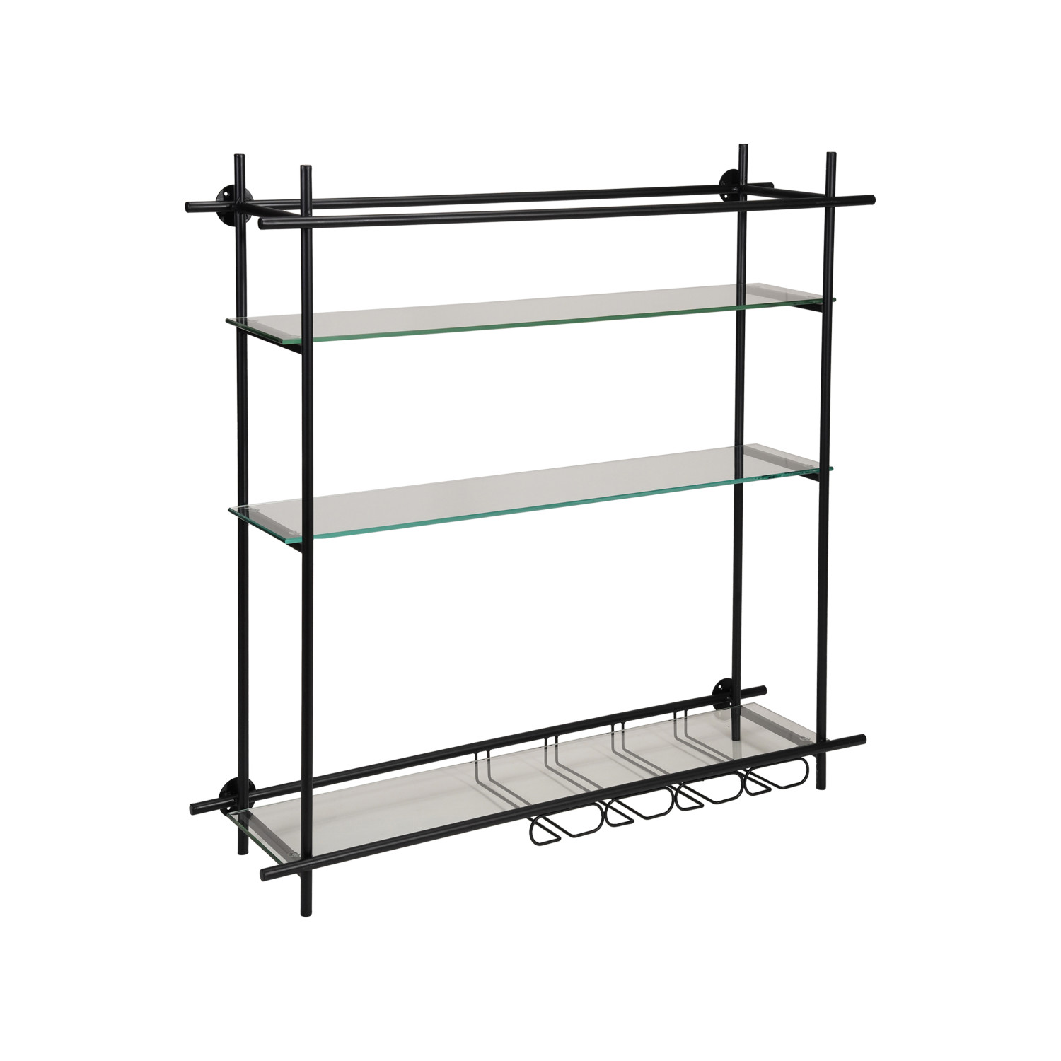 Catalog Name: 35"W x 9"D x 33-1/4"H Metal & Glass Wall Shelf w/ 3 Shelves & 4 Stemmed Glass Holders, Black, Truck Ship (Holds 8 Glasses)