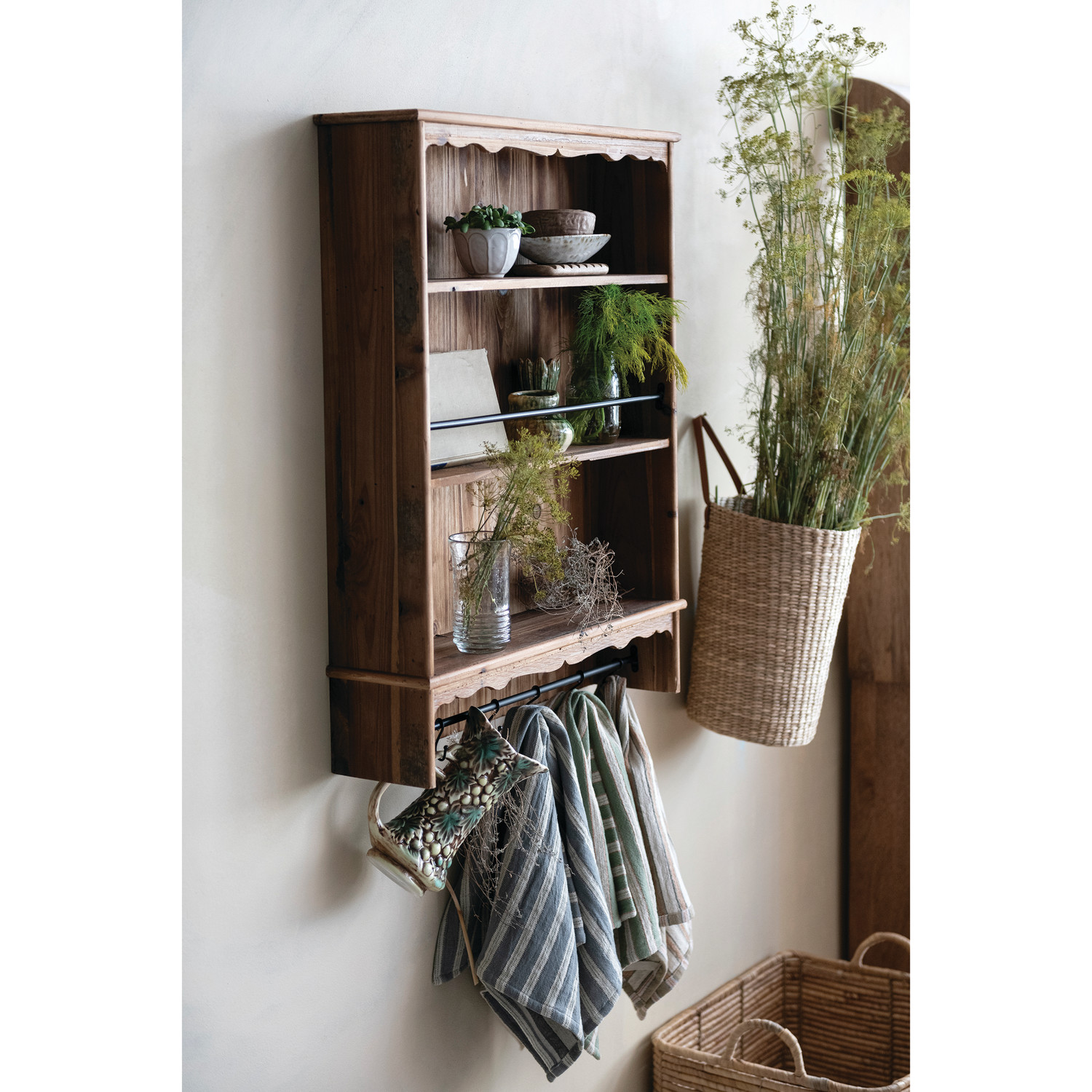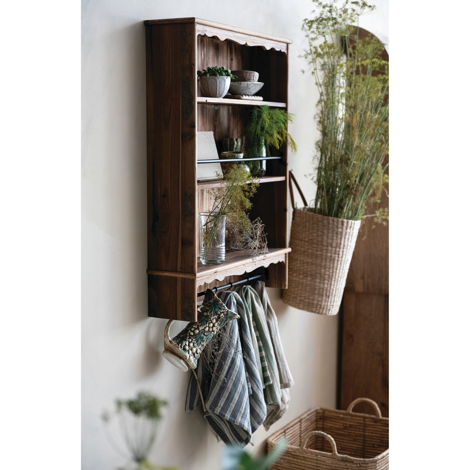Wood Wall Shelf with 3 Shelves, 2 Rods & 6 Hooks, Natural